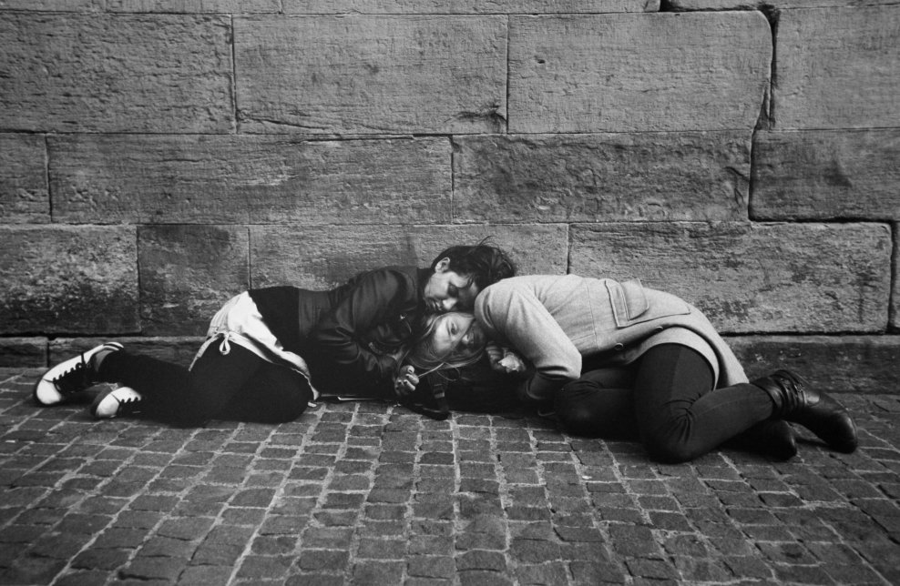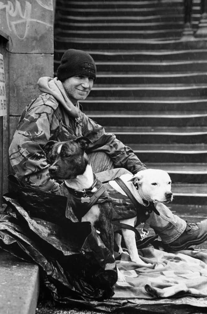 "Begger Collin in the rain with pals Jake & Tia" by Dave Lind