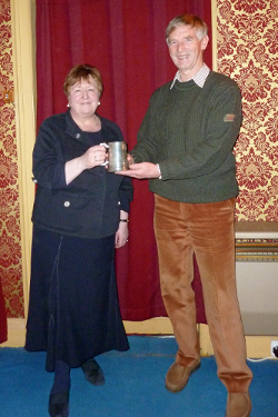 ![]() 2011 Budgie Cup Winner Bryce Morrison is presented with the trophy by judge Edith Smith |