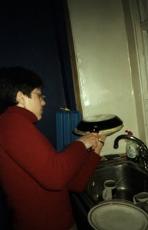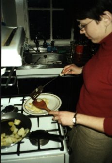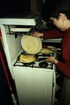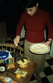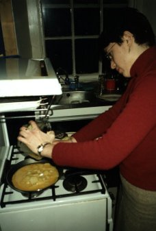 "Entonces, la colocación de una placa concluído la tapa de la cacerola que fríe, y ejercitar la precaución extrema, ¡dan la vuelta a la tortilla!" |