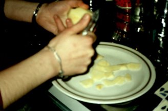 | "Cerciórese de que usted los corte finalmente en rebanadas - pero tan delgadamente como las patatas a la inglesa de patata pues usted no quisiera que se quemaran. Quizás cerca de 3 milímetros de grueso deben hacer el truco. Agregue un poco sal también." |
