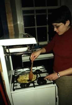 | "Bajo fría las patatas rebanadas en un poco de aceite de oliva, siendo seguro no permitir que se peguen al fondo de la cacerola. Una vez que sean suaves, usted es listo para la etapa siguiente." |