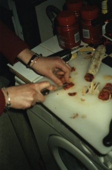 "Ahora está la época de preparar cualquier ingrediente adicional de que usted puede ser que tenga gusto de tener en su tortilla - por ejemplo chorizo, una salchicha española hecha de cerdos. Corte cualquier ingrediente adicional en rebanadas pequeñas." |
